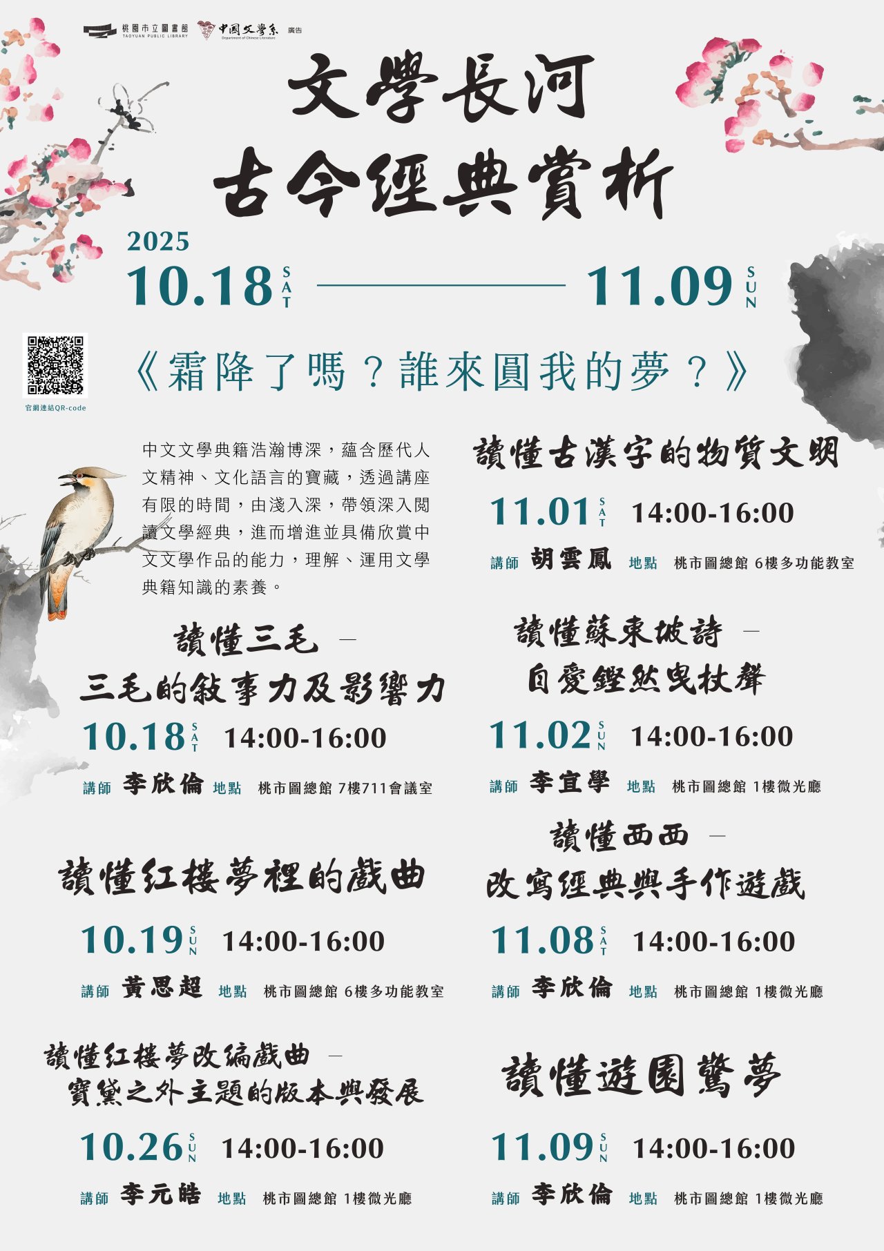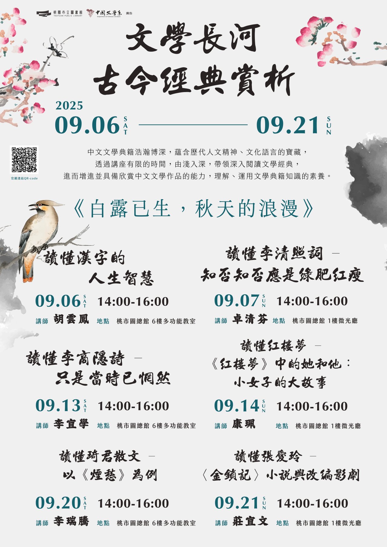 一、為推廣文學之美,本館特邀國立中央大學中國文學系學者,共同舉辦「文學長河 古今經典賞析」系列講座。