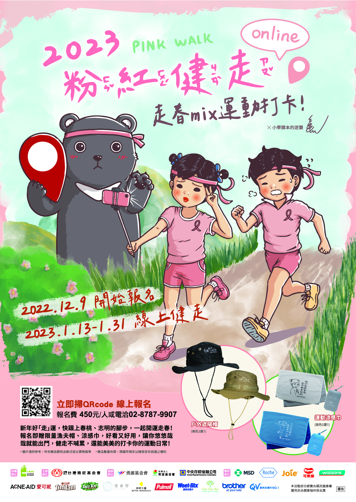 三、「2023粉紅健走:走春mix運動打卡」為線上健走形式,可透過活動網站隨時線上完成報名,報名即可獲得報名禮包,活動期間內使用任何手機APP或運動手錶等運動紀錄工具,不限時間、地點,隨時上傳健走公里數截圖至活動網站,累積里程就能抽大獎,同時收到各式各樣的防癌衛教訊息。