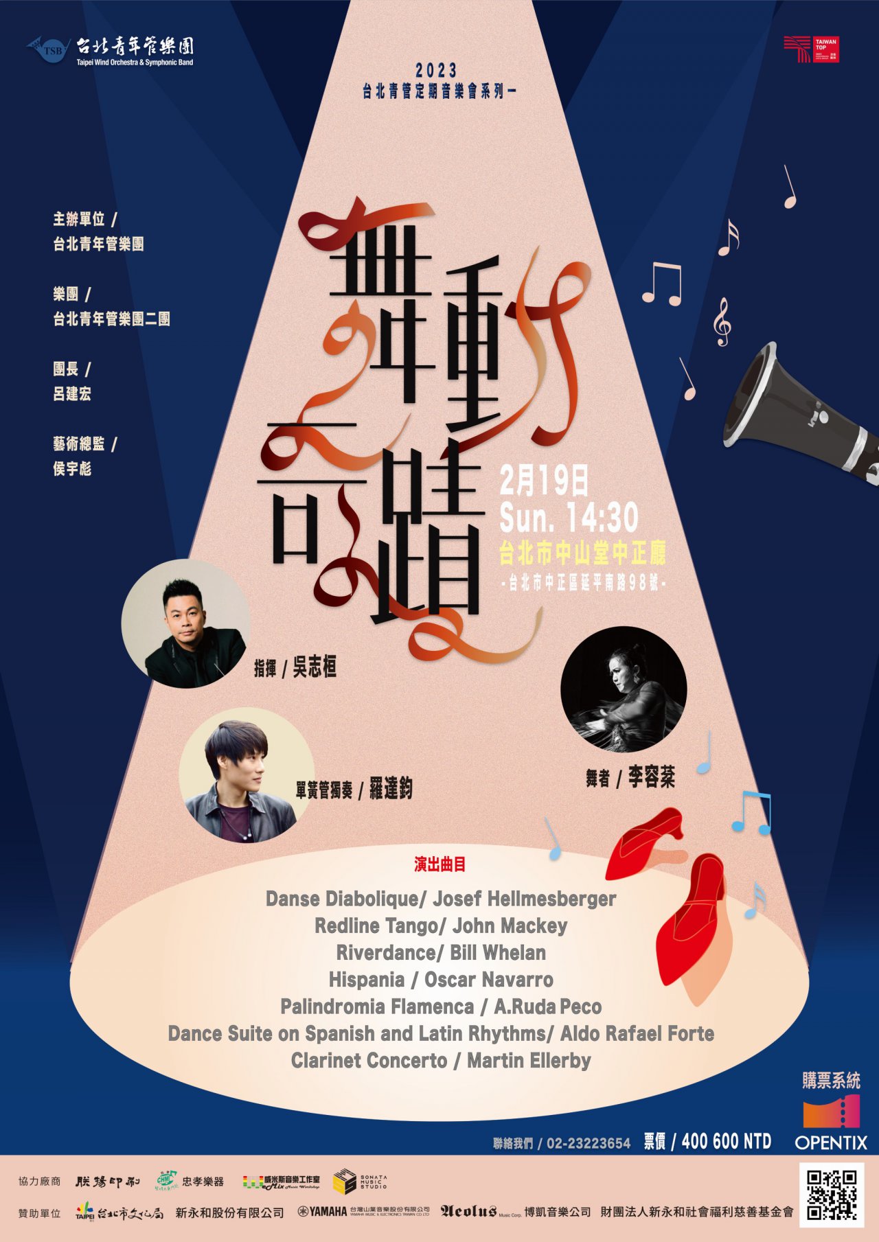 一、 2023台北青管定期音樂會系列一,由台北青年管樂團二團演出、指揮吳志桓,並邀請佛朗明哥舞者李容棻同台演出,單簧管獨奏家羅達鈞演出協奏曲,帶來一連串好聽悅耳的舞曲,不可錯過。
