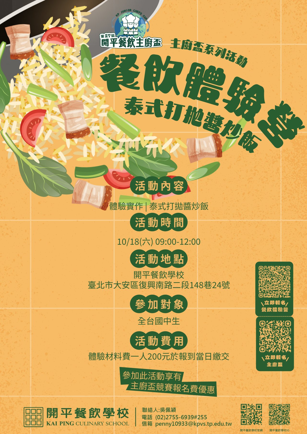 | 一、 | 本次活動結合第27屆主廚盃國中競賽活動,透過「泰式打拋醬炒飯」實作體驗更加了解技職教育,以料理展現自我、創造未來無限可能。 |