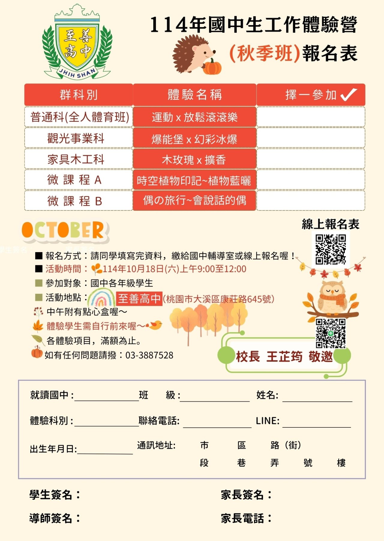 主旨:檢送桃園大溪「至善高中」辦理114學年度第1學期『國中生體驗營(秋季營)』,敬邀貴校國中生對此體驗有興趣者踴躍參加,