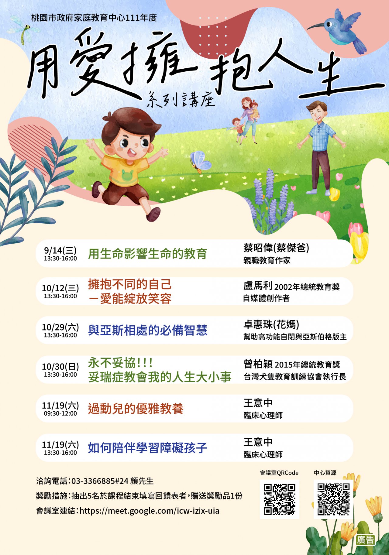1、 | 用生命影響生命的教育,111年9月14日(星期三)下午13時30分至16時,講師:蔡昭偉(蔡傑爸)。 |