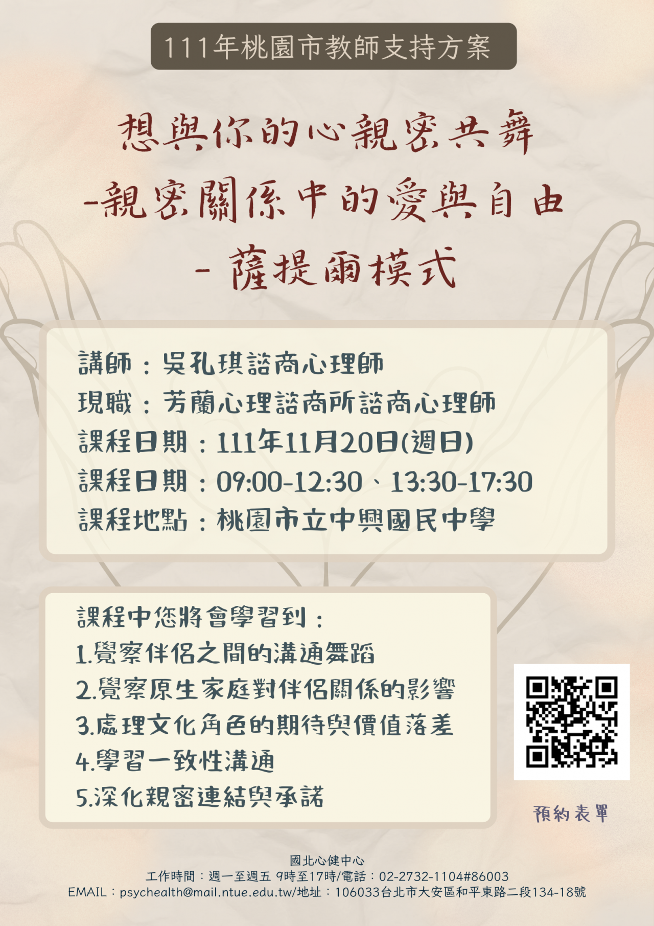 為提供本市教師全面性的服務資源及促進教師與伴侶間的溝通、自我探索,國立臺北教育大學(心理諮商暨健康促進研究中心)規劃實體工作坊1場次。 |