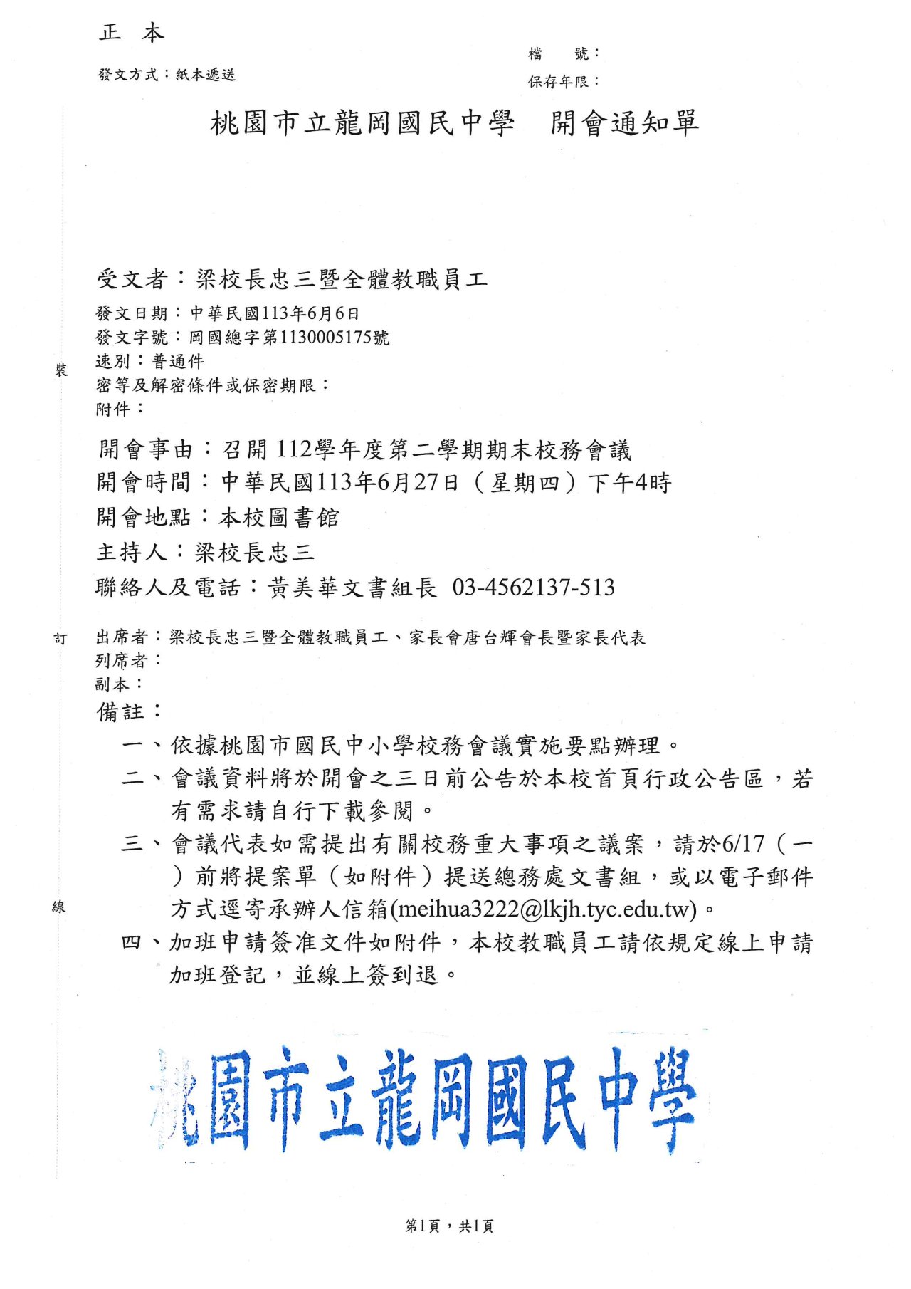 開會事由:召開本校112學年度第二學期期末校務會議 開會時間:中華民國113年6月27日(星期四)下午4時00分 開會地點:本校圖書館 主持人:梁校長忠三 聯絡人及電話:總務處文書組長,(03)4562137分機513 出席者:梁忠三校長暨全體同仁、家長會唐台輝會長暨家長代表