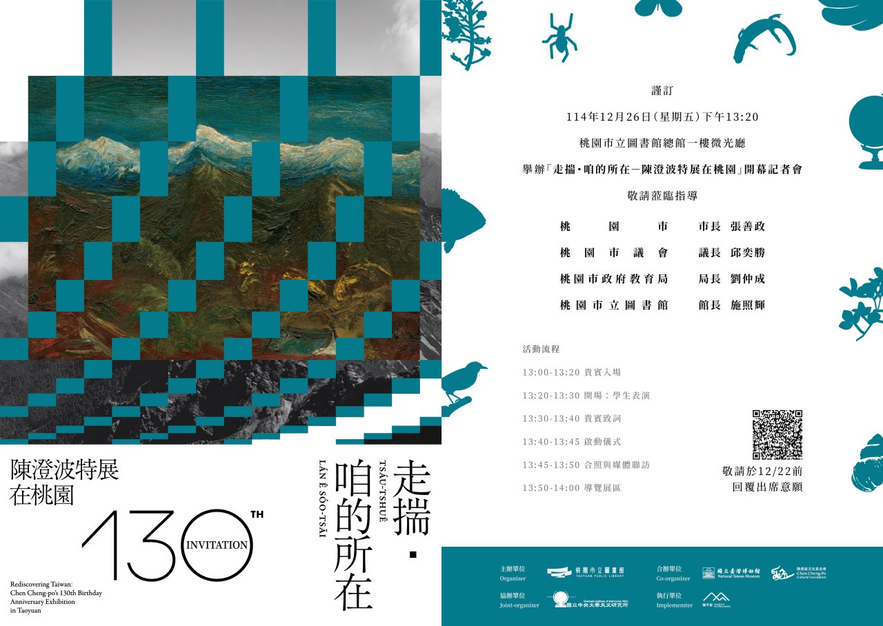 | 二、 | 謹訂於12月26日於桃園市立圖書館總館1樓微光廳,舉辦旨揭展覽開幕記者會(附件1),敬請蒞臨指導,懇請於12月22日前回覆出席意願(https://docs.google.com/forms/d/e/1FAIpQLSdU7vyri0BY6BxwOIn-TMpnk_-D0yBt4SMrAhC8rhLIsgtUdQ/viewform?usp=dialog)。 |
